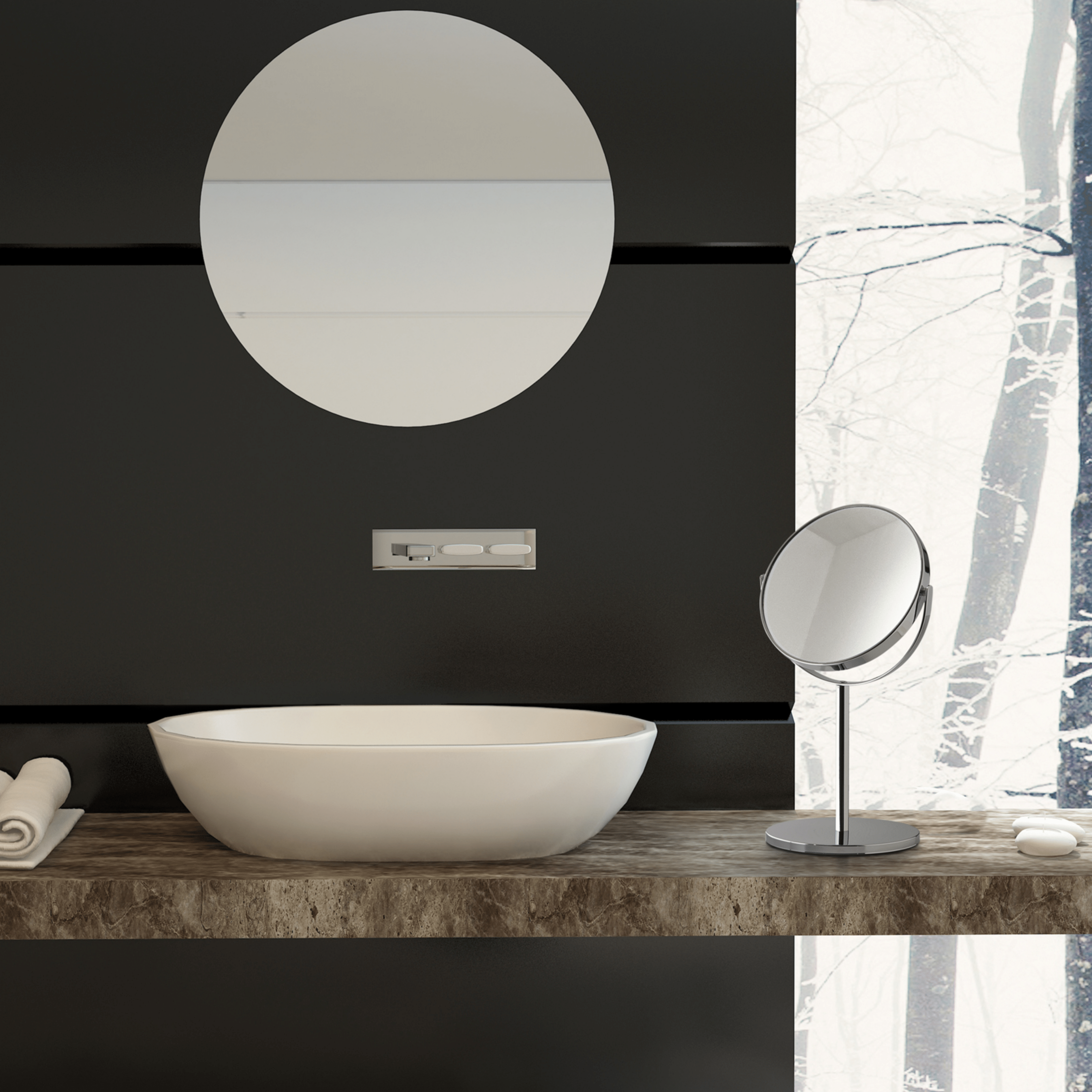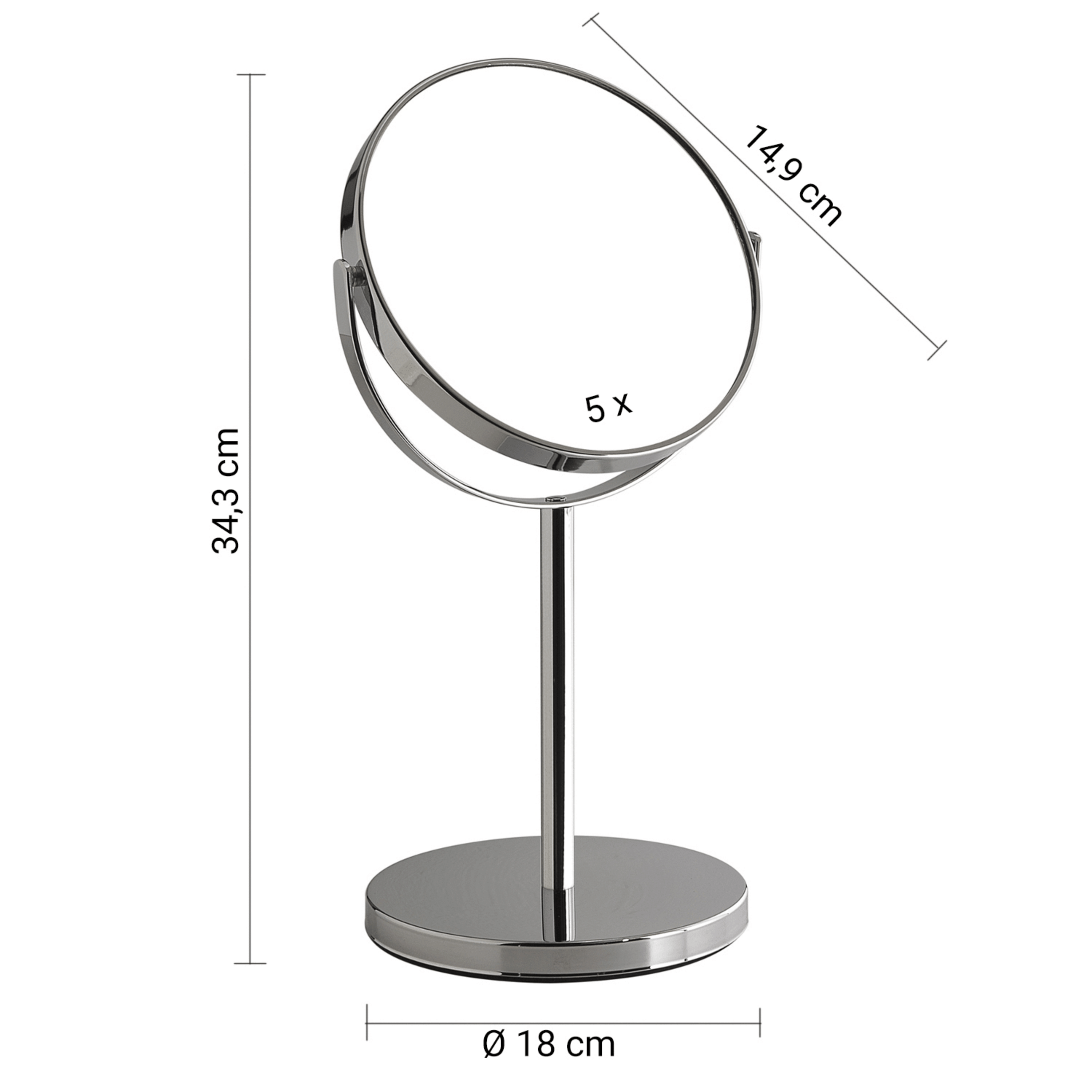 Specchio ingranditore e non, bifacciale, dotato di un lato normale e di un lato con fattore di ingrandimento 5x. La struttura è progettata per offrire stabilità e una rotazione fluida, garantendo una visione chiara e dettagliata per tutte le attività di precisione della routine quotidiana.