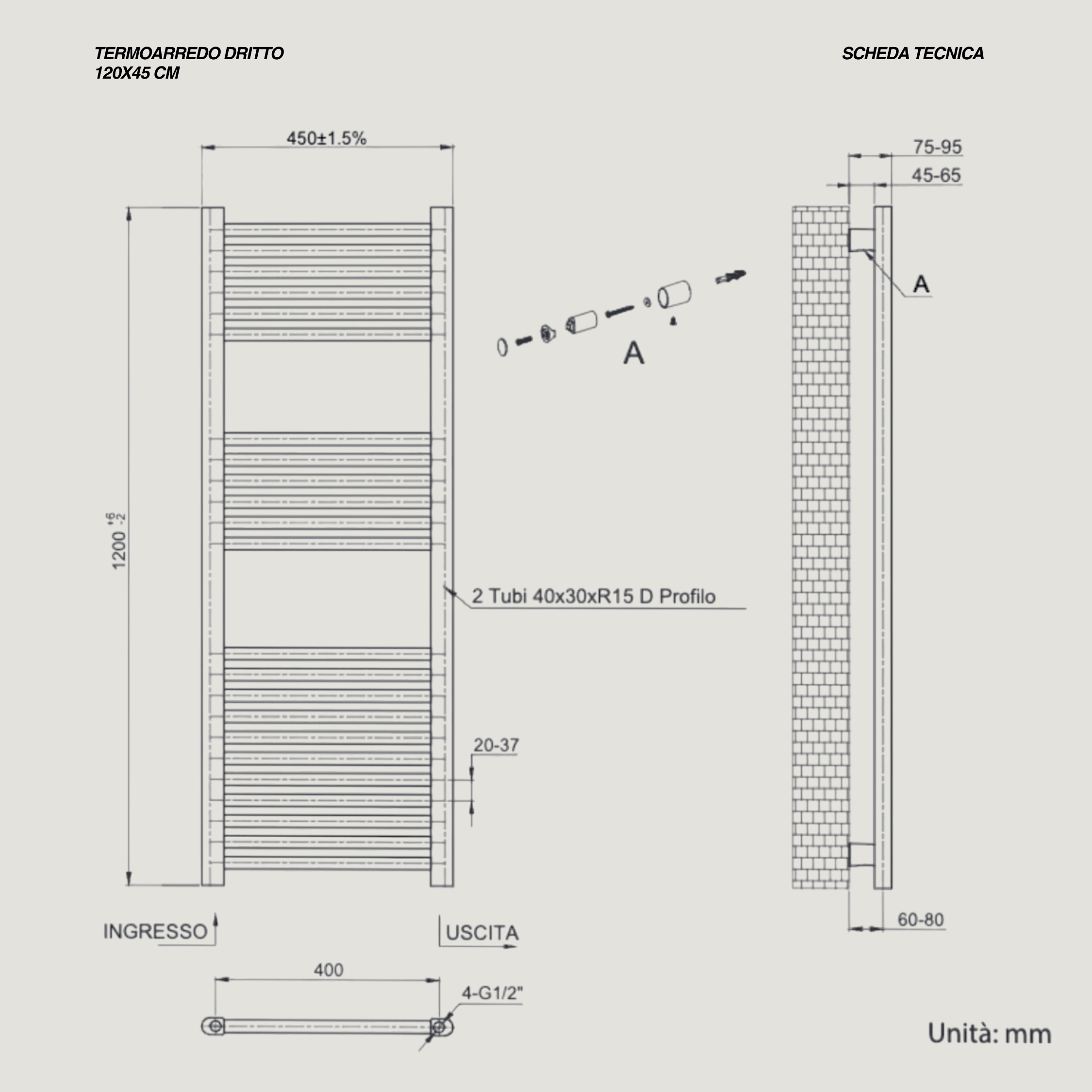 Il termoarredo dritto H120 × L45 cm è una soluzione compatta, elegante e altamente funzionale, pensata per garantire comfort termico anche negli spazi bagno più contenuti. La sua struttura verticale, essenziale e armoniosa, si integra con facilità in ambienti moderni, offrendo un equilibrio ideale tra design minimale e prestazioni affidabili.La finitura bianca dona luminosità e pulizia visiva, rendendo il termoarredo un elemento discreto ma raffinato, capace di valorizzare qualsiasi stile d’arredo. I 23 tubi in acciaio, con diametro di 22 mm, assicurano una diffusione uniforme del calore e un rapido riscaldamento dell’ambiente, migliorando il comfort quotidiano con consumi contenuti.Il termoarredo è predisposto per l’allacciamento a impianto idraulico tradizionale. Non include il kit copritubo né il kit valvola + detentore, acquistabili separatamente in base alle esigenze estetiche e funzionali del progetto.