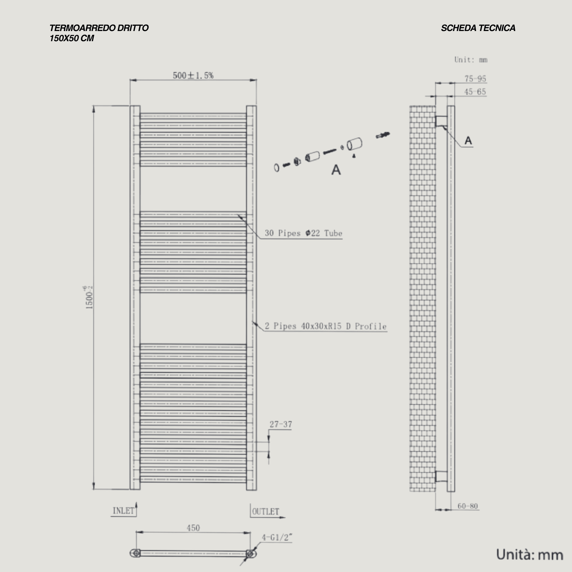 Il termoarredo dritto H150 × L50 cm è una soluzione elegante e funzionale pensata per garantire un comfort termico ottimale in ambienti bagno di medie dimensioni. La sua struttura verticale, caratterizzata da linee essenziali e da un design pulito, si integra perfettamente in contesti moderni, offrendo un equilibrio ideale tra estetica minimale e prestazioni affidabili.La finitura bianca conferisce luminosità e armonia visiva, rendendo il termoarredo un elemento discreto ma raffinato, capace di valorizzare qualsiasi stile d’arredo. I 30 tubi in acciaio, con diametro di 22 mm, assicurano una diffusione uniforme del calore e un rapido riscaldamento dell’ambiente, migliorando il comfort quotidiano con consumi contenuti.Il termoarredo è predisposto per l’allacciamento a impianto idraulico tradizionale. Non include il kit copritubo né il kit valvola + detentore, acquistabili separatamente in base alle esigenze estetiche e funzionali del progetto.