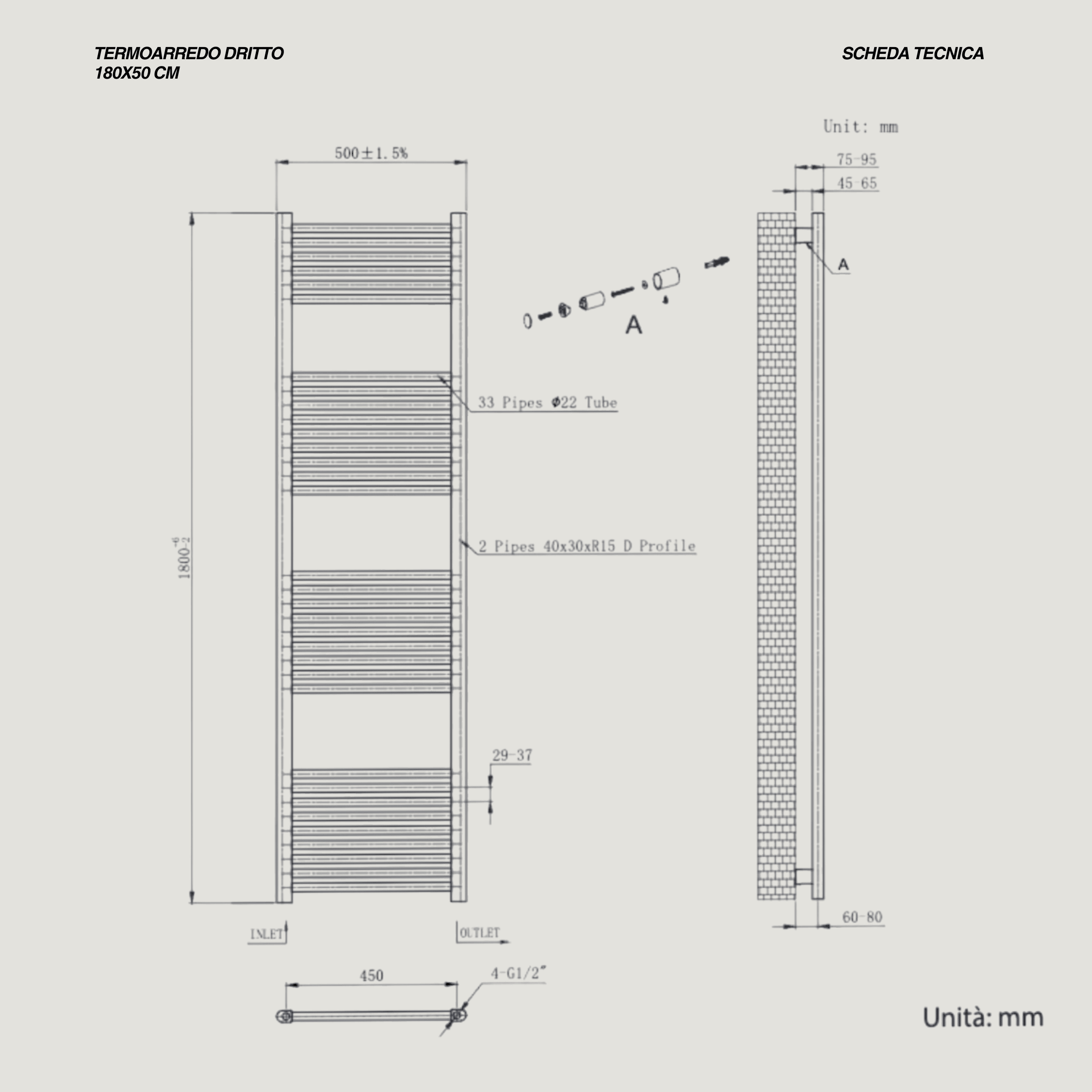Il termoarredo dritto H180 × L50 cm rappresenta una soluzione di riscaldamento moderna, essenziale e altamente funzionale, progettata per integrarsi con naturalezza in ambienti bagno contemporanei. La struttura verticale, caratterizzata da linee pulite e da un design equilibrato, offre un’elevata resa termica mantenendo un ingombro ridotto, ideale per ottimizzare gli spazi senza rinunciare al comfort.La finitura nero opaco conferisce un carattere deciso e sofisticato, perfetto per chi desidera un elemento d’arredo che unisca estetica e prestazioni. I 33 tubi in acciaio, dal diametro di 22 mm, garantiscono una diffusione uniforme del calore e un rapido raggiungimento della temperatura desiderata. L’interasse da 45 cm assicura compatibilità con la maggior parte degli impianti esistenti, facilitando l’installazione.Il termoarredo è predisposto per l’installazione idraulica tradizionale. Non include il kit copritubo né il kit valvola + detentore, acquistabili separatamente in base alle esigenze estetiche e funzionali dell’impianto.