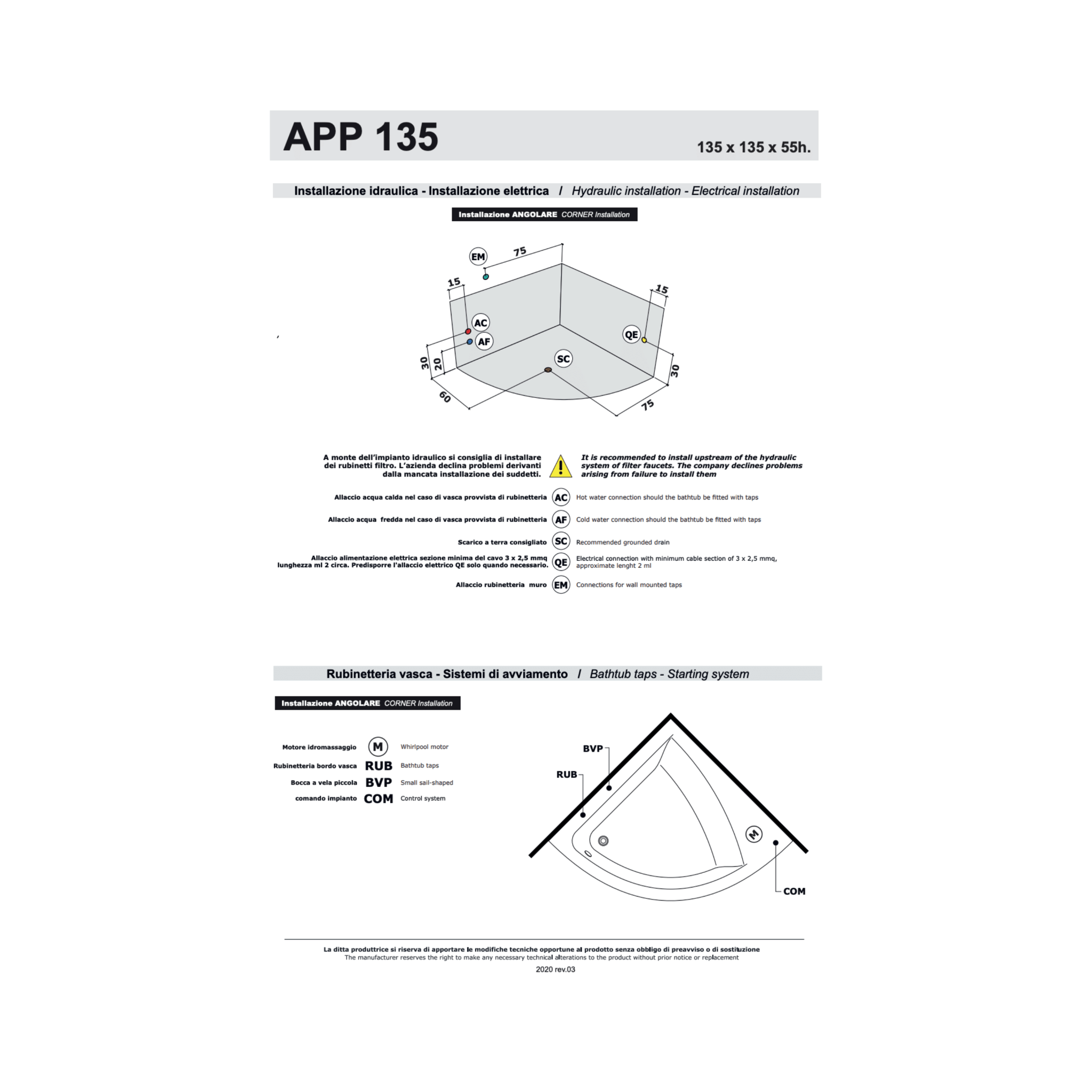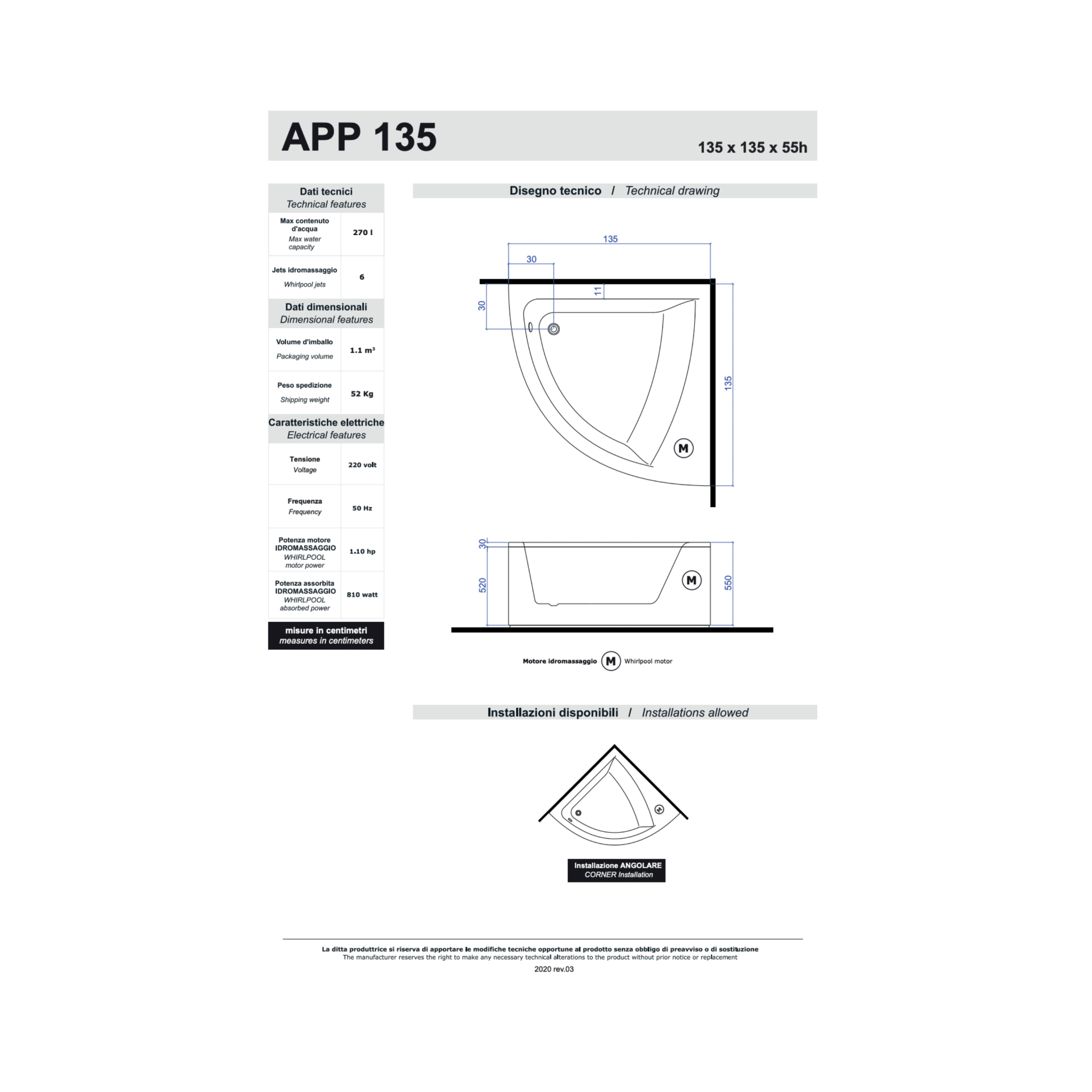 App 135 è la soluzione che ben si adatta a ogni tipo di bagno, da quello più grande a quello più piccolo. Le dimensioni di App 135 sono 135x135xH55 cm e può essere installata ad angolo con o senza il pannello frontale.Le sue linee semplici e lineari si accompagnano perfettamente a un arredo bagno di tipo moderno e, perché no, anche più classico.E' proposta anche nella versione con idromassaggio con sei jet: il momento del bagno sarà ancor più rilassante e rigenerante. Il bacino interno leggermente stondato renderà ancor più comodo e funzionale l’appoggio, così da potersi abbandonare a un benessere totale e dimenticare le fatiche della giornata.