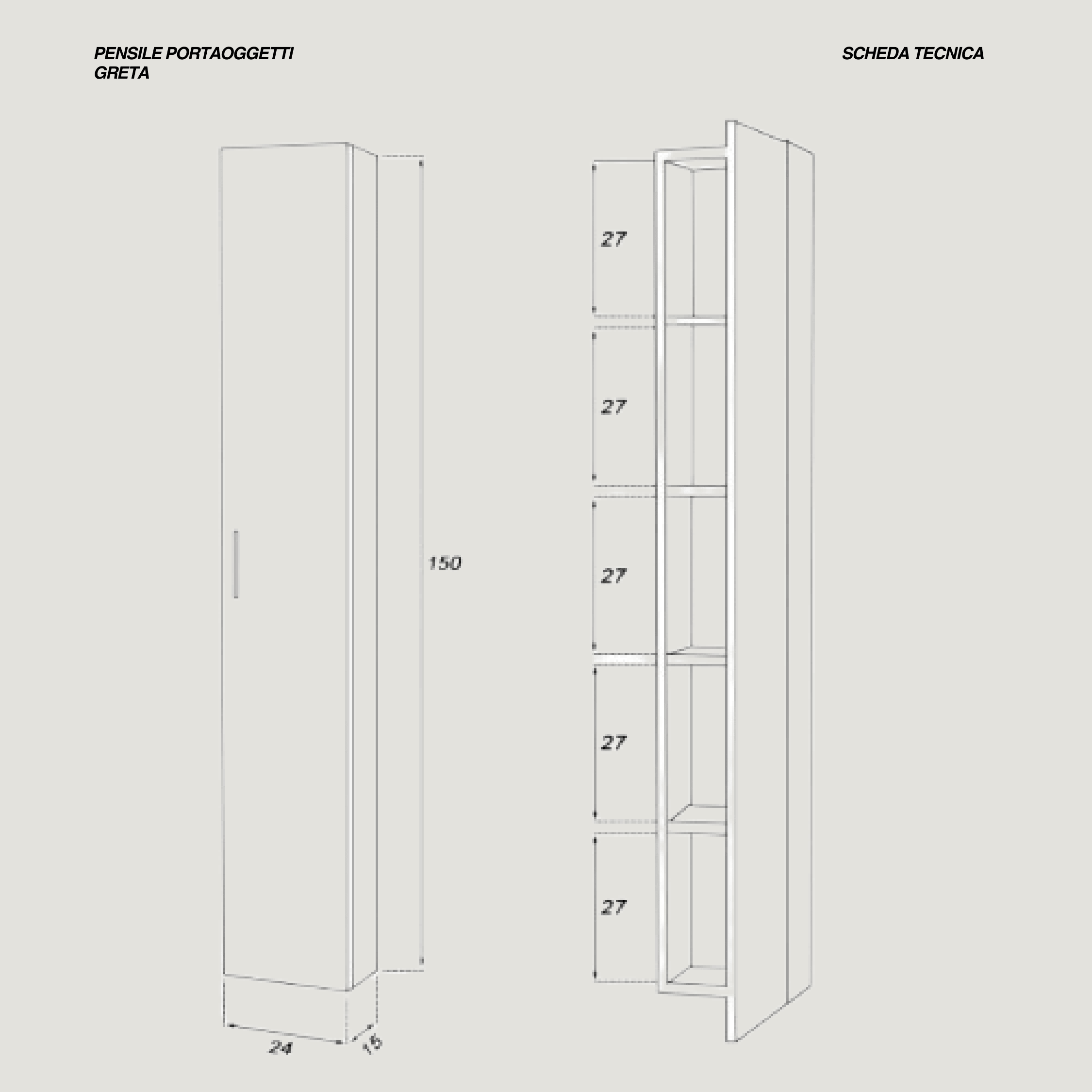 Il pensile della linea Greta è realizzato in nobilitato melaminico con finitura bianco lucido, una tonalità calda e naturale che dona eleganza e armonia all’ambiente bagno. L’anta lunga, reversibile, permette l’apertura sia a destra che a sinistra, offrendo massima flessibilità di installazione. La maniglia in finitura cromo lucido aggiunge un dettaglio moderno e raffinato.L’interno è organizzato con quattro ripiani fissi da 27 cm di altezza ciascuno, ideali per riporre in modo ordinato prodotti e accessori di uso quotidiano. La struttura compatta e slanciata consente di sfruttare al meglio lo spazio verticale senza appesantire la parete.