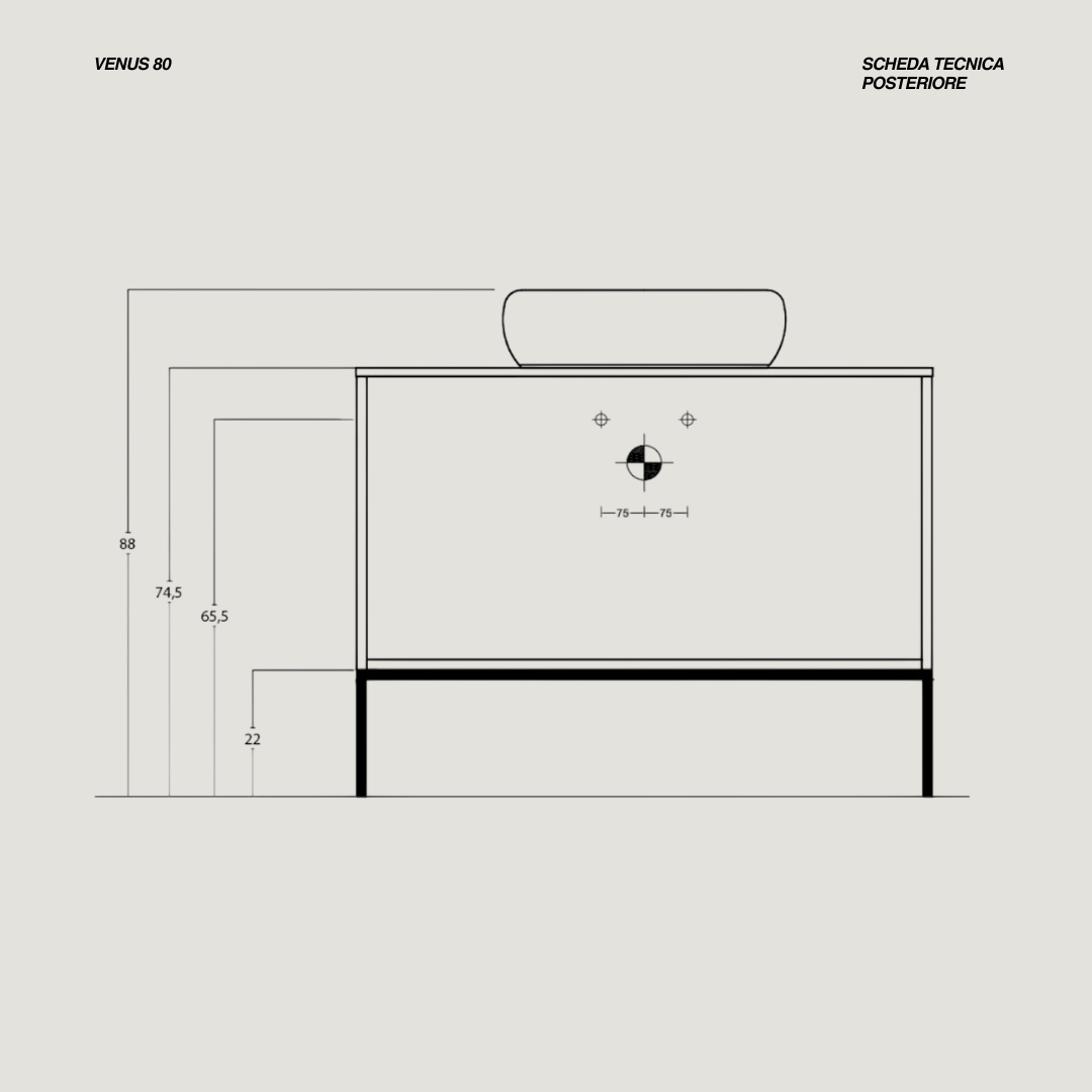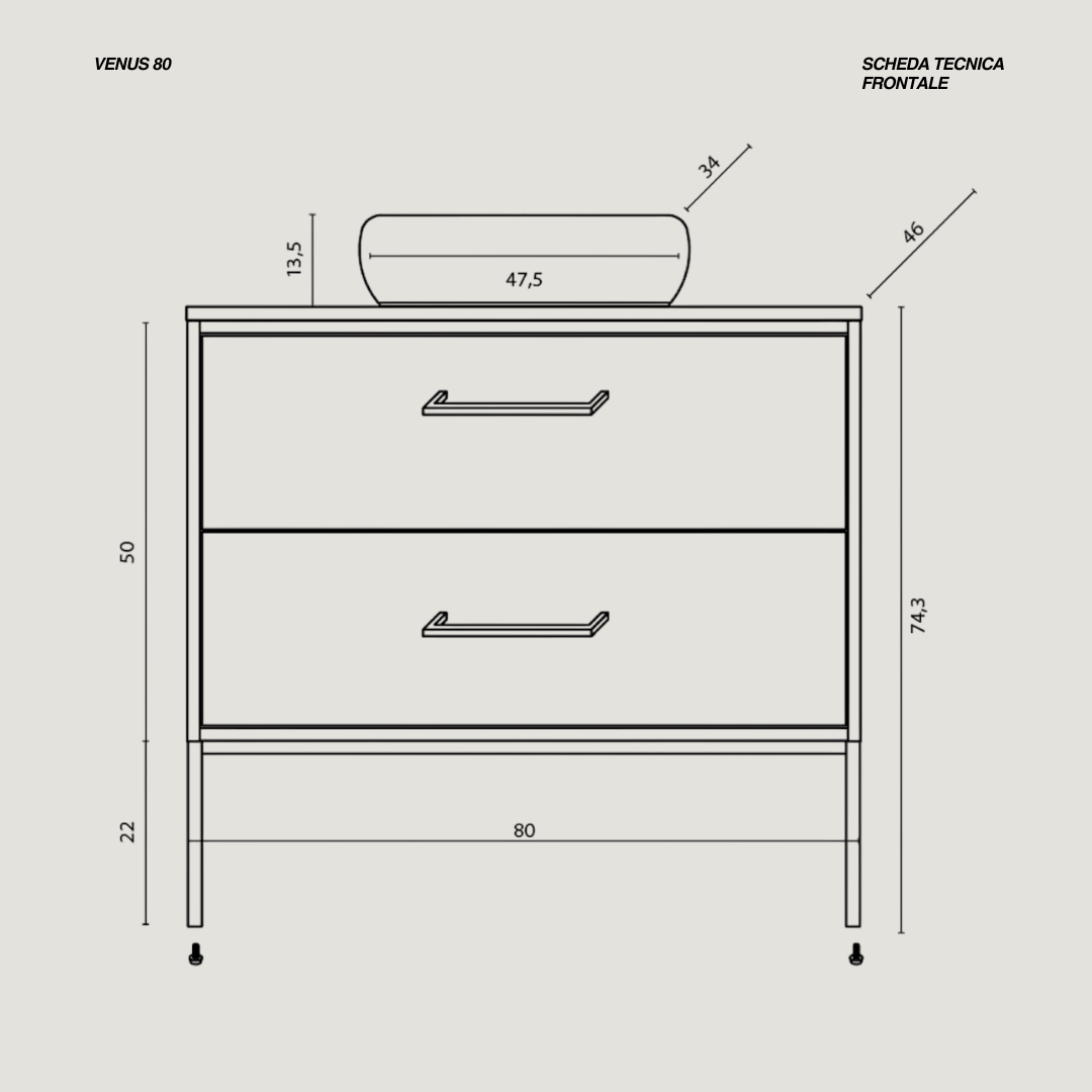 La composizione bagno sospesa della linea Venus è proposta in kit da assemblare ed è realizzata in nobilitato melaminico da 18 mm e MDF, con una finitura bianco opaco che dona carattere e modernità all’ambiente. Il mobile, dalle linee pulite e contemporanee, è dotato di due cassetti con sistema soft close che garantisce una chiusura silenziosa e controllata, mantenendo ordine e praticità nell’uso quotidiano. La struttura sospesa valorizza la leggerezza del design e facilita la pulizia del pavimento, rendendo l’insieme elegante e funzionale.Il lavabo da appoggio in ceramica aggiunge un tocco di raffinatezza, mentre lo specchio a filo, dal diametro di 60 cm, completa la composizione con un’estetica essenziale e armoniosa. Le dimensioni del mobile, L80 × H74 × P46 cm, offrono un buon equilibrio tra capienza e ingombro, adattandosi facilmente a bagni di diverse metrature. Il lavabo misura 47,5 × 34 cm ed è privo di foro rubinetteria, permettendo la scelta libera di un miscelatore a parete o da piano.La composizione non include la rubinetteria.Il kit è progettato per un montaggio semplice e intuitivo, garantendo un risultato finale solido, curato e perfettamente in linea con lo stile elegante della linea Venus.