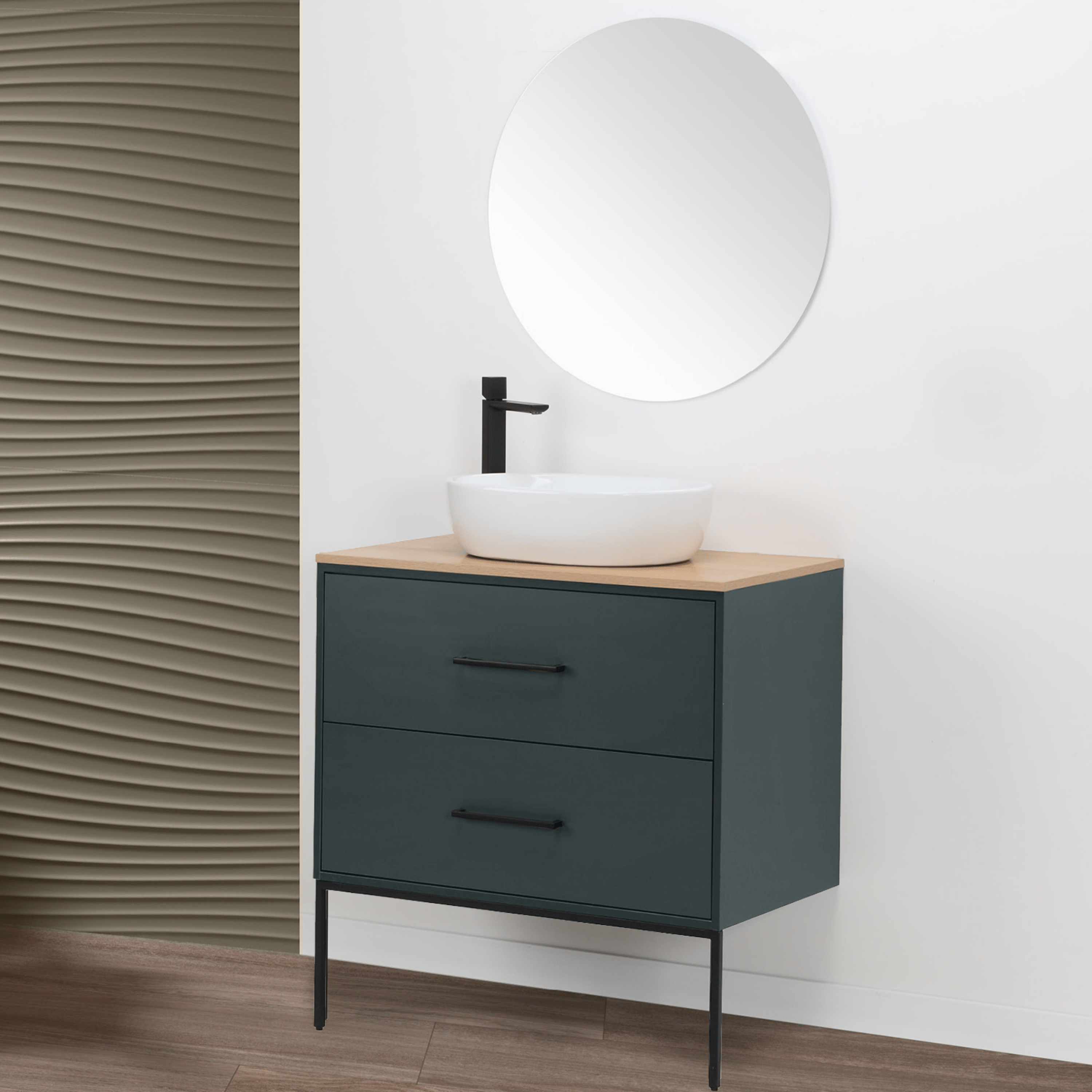 La composizione bagno sospesa della linea Venus è proposta in kit da assemblare ed è realizzata in nobilitato melaminico da 18 mm e MDF, con una finitura verde petrolio che dona carattere e modernità all’ambiente. Il mobile, dalle linee pulite e contemporanee, è dotato di due cassetti con sistema soft close che garantisce una chiusura silenziosa e controllata, mantenendo ordine e praticità nell’uso quotidiano. La struttura sospesa valorizza la leggerezza del design e facilita la pulizia del pavimento, rendendo l’insieme elegante e funzionale.Il lavabo da appoggio in ceramica aggiunge un tocco di raffinatezza, mentre lo specchio a filo, dal diametro di 60 cm, completa la composizione con un’estetica essenziale e armoniosa. Le dimensioni del mobile, L80 × H74 × P46 cm, offrono un buon equilibrio tra capienza e ingombro, adattandosi facilmente a bagni di diverse metrature. Il lavabo misura 47,5 × 34 cm ed è privo di foro rubinetteria, permettendo la scelta libera di un miscelatore a parete o da piano.La composizione non include la rubinetteria.Il kit è progettato per un montaggio semplice e intuitivo, garantendo un risultato finale solido, curato e perfettamente in linea con lo stile elegante della linea Venus.