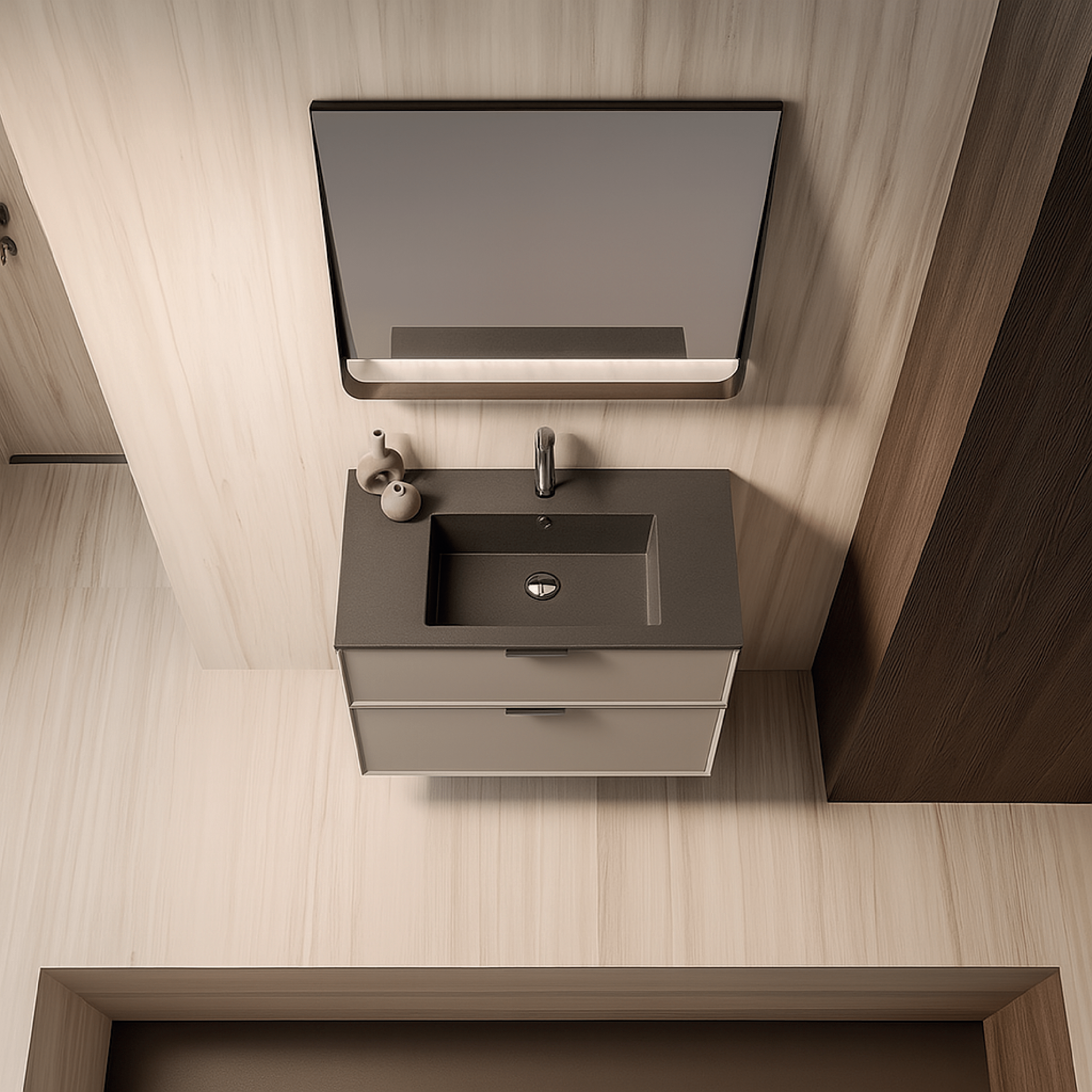 Questo mobile da bagno incarna l’eleganza della semplicità, che dona leggerezza visiva e facilita la pulizia del pavimento sottostante. La struttura è composta da due ampi cassetti in una tonalità tortora, disponibile anche in altre diverse finiture per adattarsi perfettamente a ogni stile d’arredo.Il lavabo è realizzato in ceramica disponibile in più colorazioni e finiture: dal classico bianco al cemento, fino a tonalità più audaci come il nero o finitura ferro, che creano un contrasto sofisticato con la base.Completano la composizione uno specchio in metallo con mensola e tecnologia LED integrata dando un’atmosfera rilassante.Il sistema di illuminazione garantisce una diffusione uniforme e confortevole, ideale per l’uso quotidiano.Il mobile si inserisce armoniosamente in un ambiente rivestito di pannelli in legno, contribuendo a un’estetica calda, naturale e contemporanea.