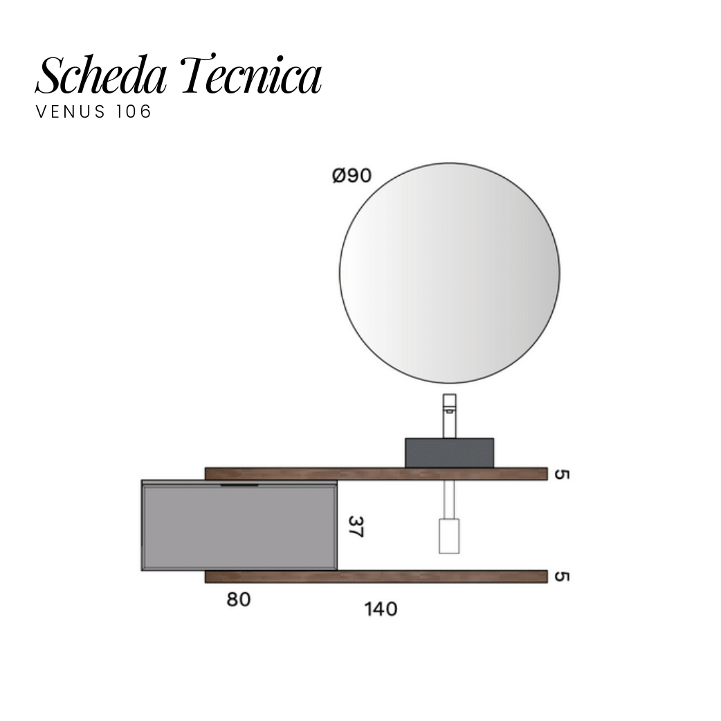Questo mobile da bagno incarna un’estetica minimalista e contemporanea, perfetta per ambienti raffinati e funzionali. La sua composizione è studiata per unire design, praticità e armonia visiva. Composto da due top in legno finitura rovere rio dalla lunghezza di 140 cm che dona calore e contrasto all’ambiente. La sua installazione sospesa crea un effetto di leggerezza e modernità. Lavabo a bacinella nero opaco: Al centro del piano si trova un lavabo circolare in ceramica, di colore nero opaco. La forma tondeggiante rompe la linearità del mobile, aggiungendo un tocco scultoreo.Sotto il piano in legno è installato un cassetto a vista, anch’esso sospeso, con finitura grigia. Questo elemento offre spazio contenitivo senza appesantire la composizione.Specchio rotondo a parete: Sopra il lavabo è montato uno specchio circolare di grandi dimensioni, privo di cornice, che riflette la luce e amplia visivamente lo spazio. La sua forma richiama quella del lavabo, creando coerenza geometrica.