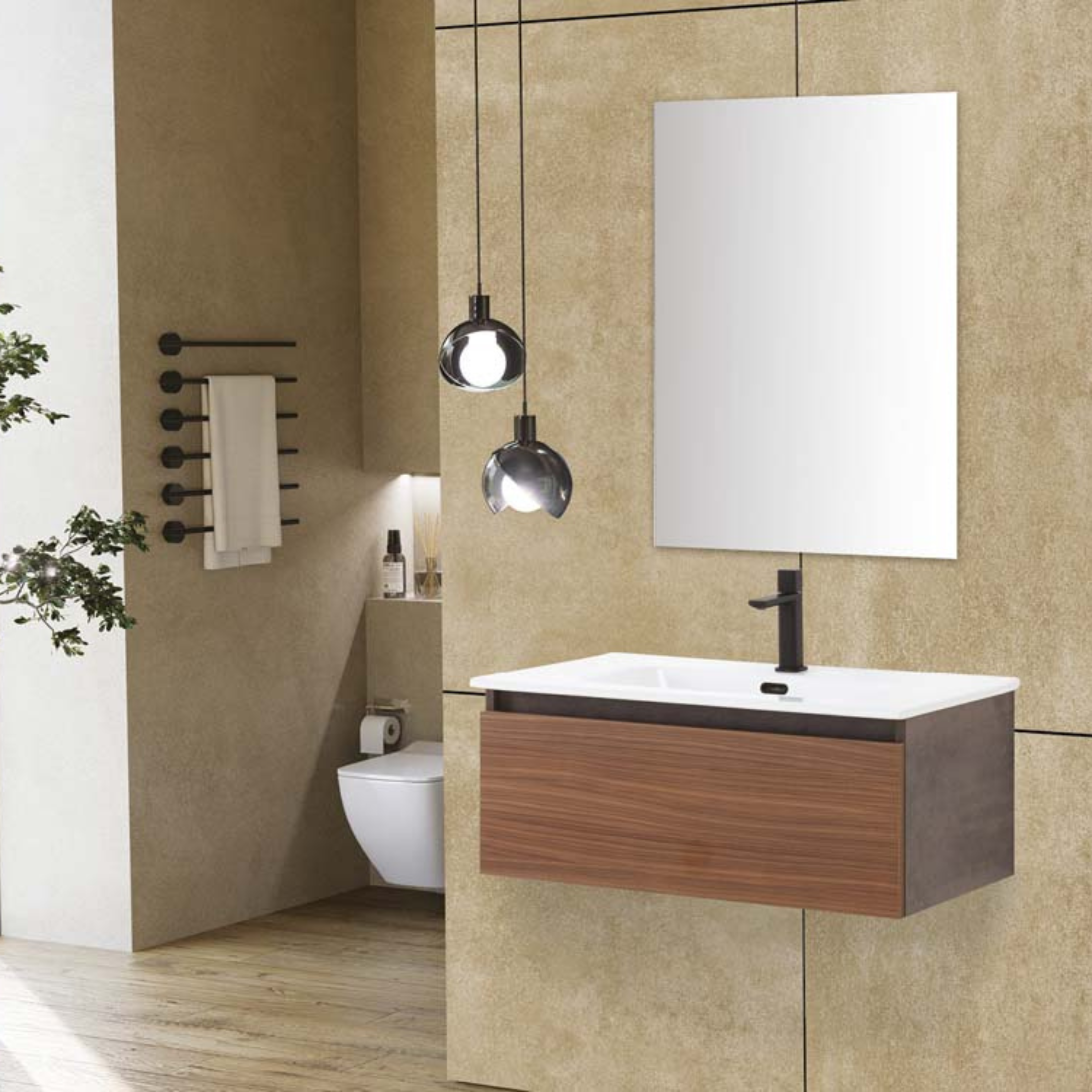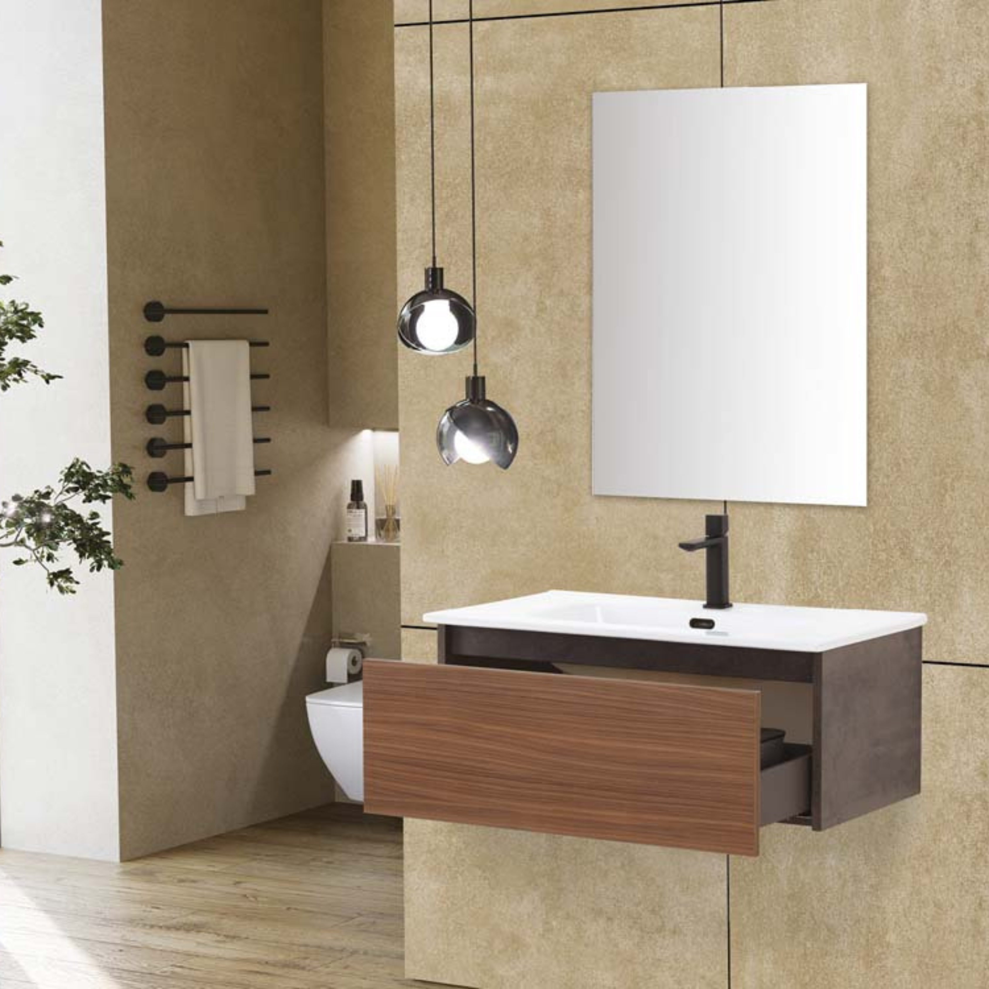 Mobile Bagno Sospeso 80 Cm Un Cassetto Specchio a Filo 80x60 Cm Feridras "Revital" Ossido Grigio/Noce Canaletto