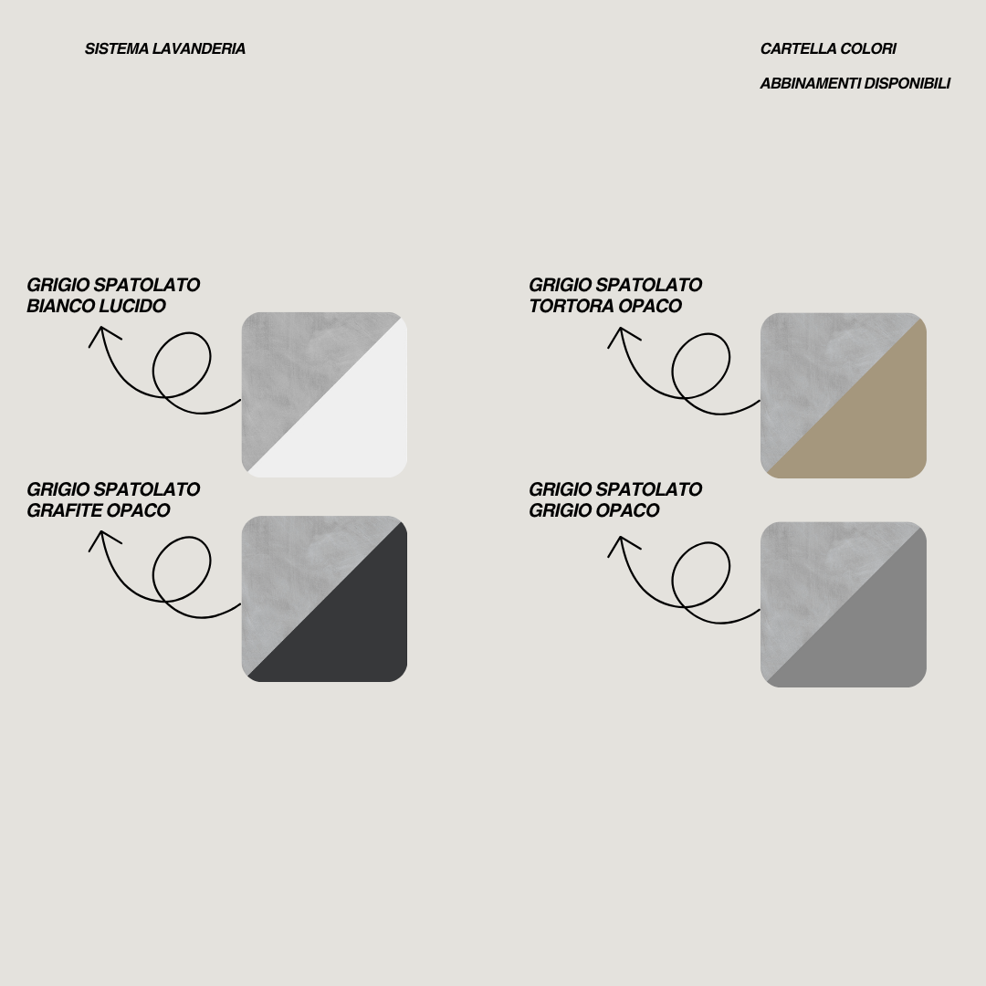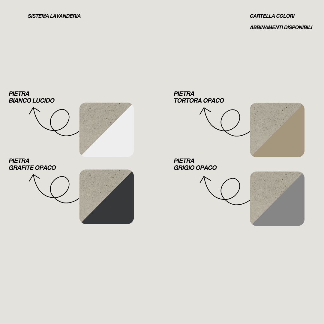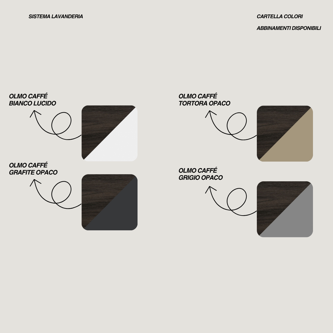 Il sistema lavanderia è completamente personalizzabile: è possibile modificare la finitura delle ante e del piano scegliendo tra le combinazioni disponibili nella cartella colori presente nei contenuti multimediali, sostituire la vasca in ceramica con una versione in termoformato, oppure integrare uno specchio di dimensioni differenti rispetto a quello proposto.