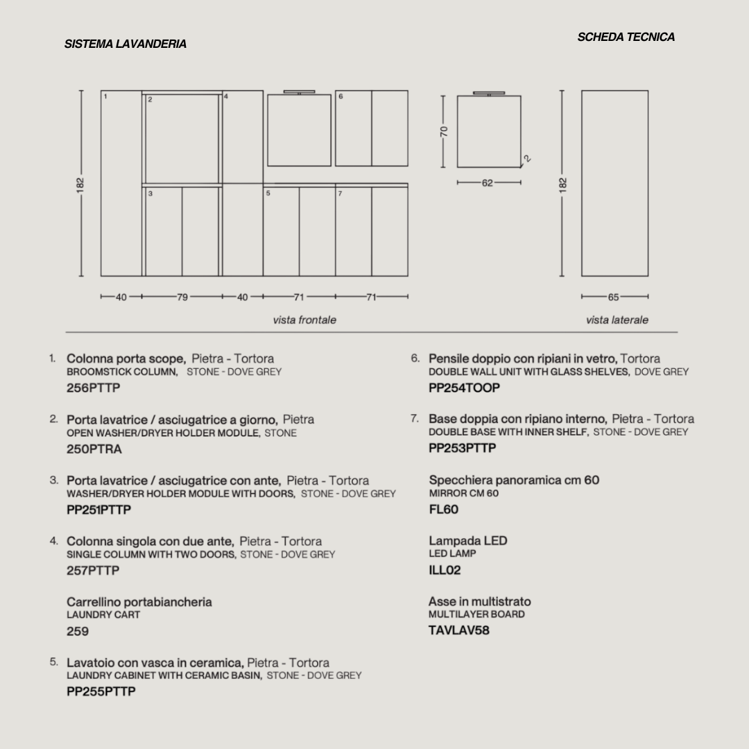 Il mobile per lavanderia è composto da una serie di moduli componibili, progettati per adattarsi a esigenze specifiche e consentire la creazione di una configurazione su misura per ogni ambiente. La gamma include elementi studiati con la massima attenzione ai dettagli: portalavatrice e portasciugatrice per una disposizione ordinata degli elettrodomestici, modulo con vasca lavatoio in ceramica per un lavaggio pratico e funzionale, base doppia per un’organizzazione extra, colonna porta scope per mantenere in ordine gli accessori di pulizia, colonna multiuso per detersivi e biancheria, e carrello portabiancheria per facilitare il trasporto dei capi sporchi e puliti. Tutti i moduli sono dotati di ante con sistema di apertura push and pull, per un’estetica pulita e un utilizzo intuitivo.