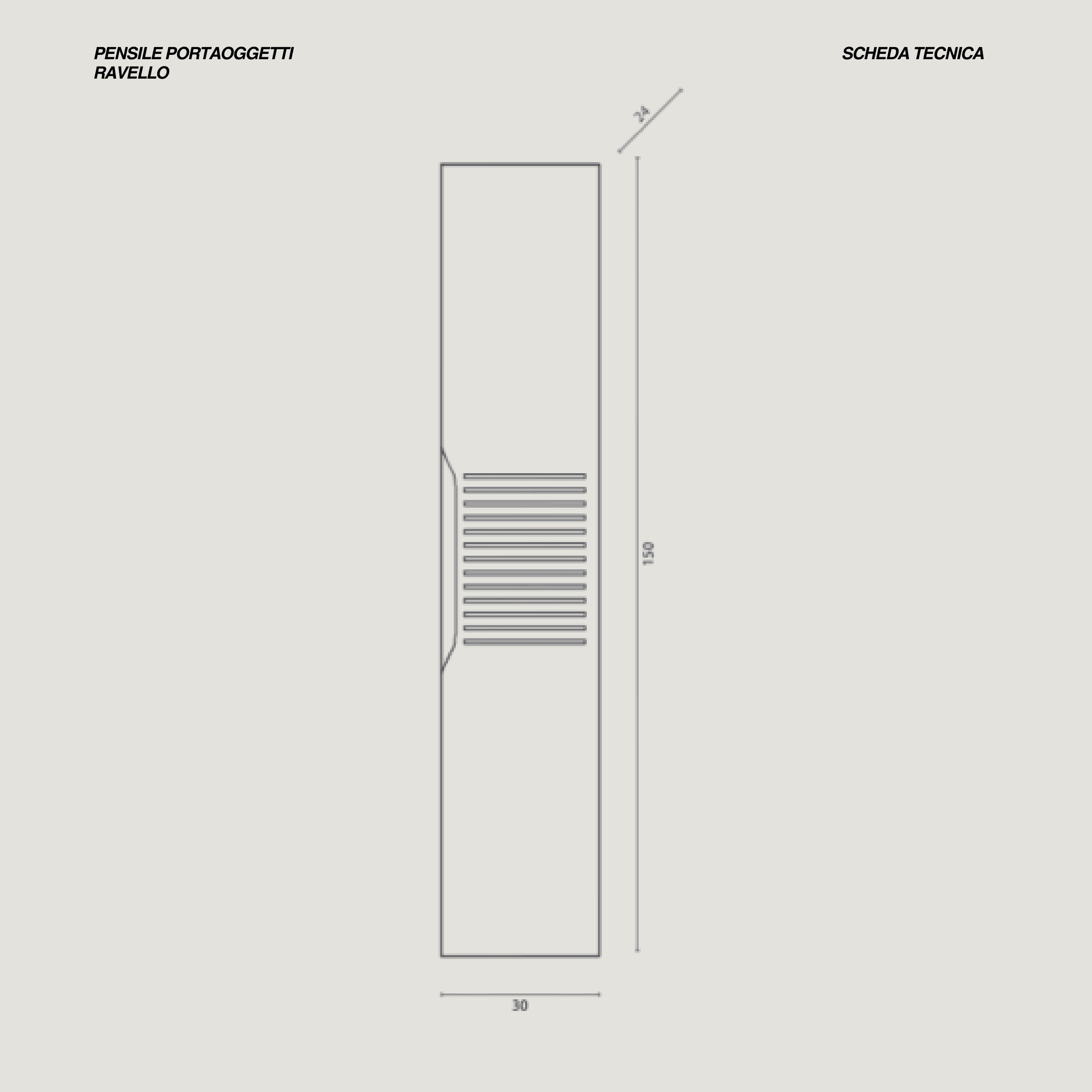 Il pensile della linea Ravello è realizzato in MDF rivestito in PVC, con una cassa in finitura ardesia dallo spessore di 20 mm e un frontale in noce canaletto, anch’esso da 20 mm, che dona un effetto materico elegante e contemporaneo. La combinazione delle due finiture crea un contrasto raffinato, valorizzando la verticalità del mobile e rendendolo un elemento d’arredo distintivo all’interno dell’ambiente bagno.L’anta è dotata di cerniere slow motion che assicurano un’apertura morbida e silenziosa, mentre la maniglia a gola integrata mantiene il design pulito e minimale. L’interno è organizzato con cinque scomparti, pensati per offrire uno spazio contenitivo funzionale e ben strutturato, ideale per prodotti, accessori e piccoli oggetti quotidiani. Con dimensioni L30 × H150 × P24 cm, il pensile si integra facilmente in diverse configurazioni, aggiungendo capienza senza appesantire la composizione.