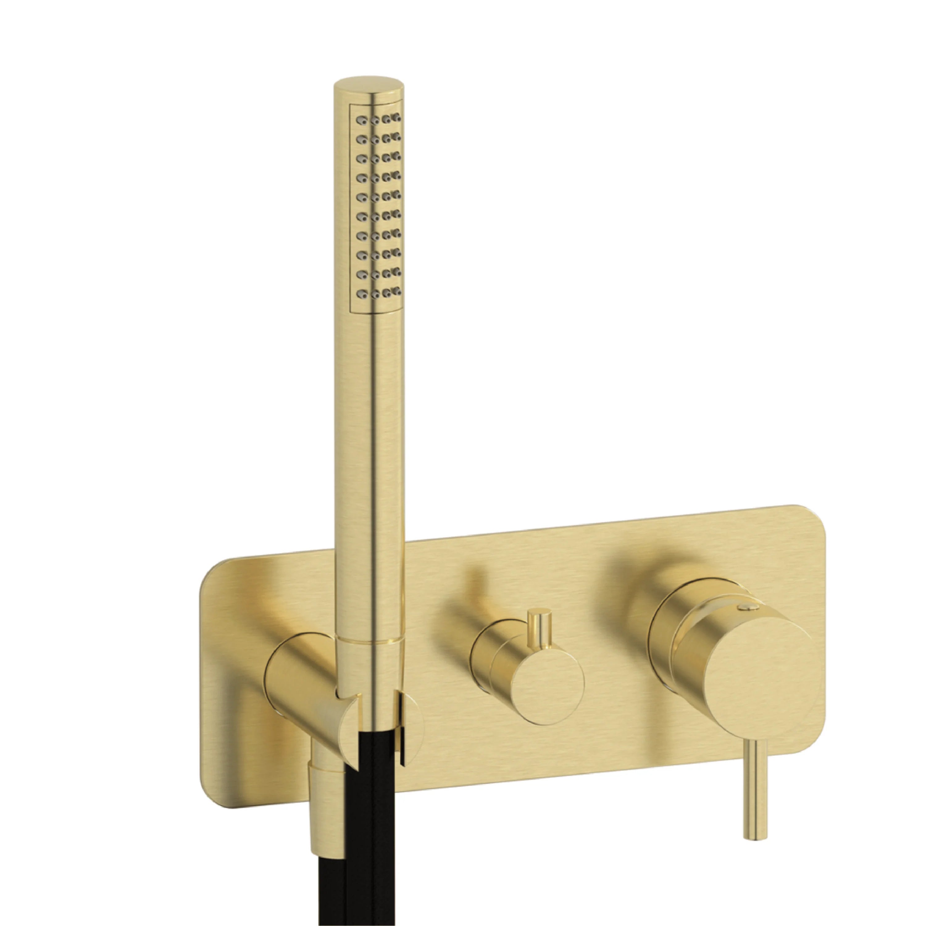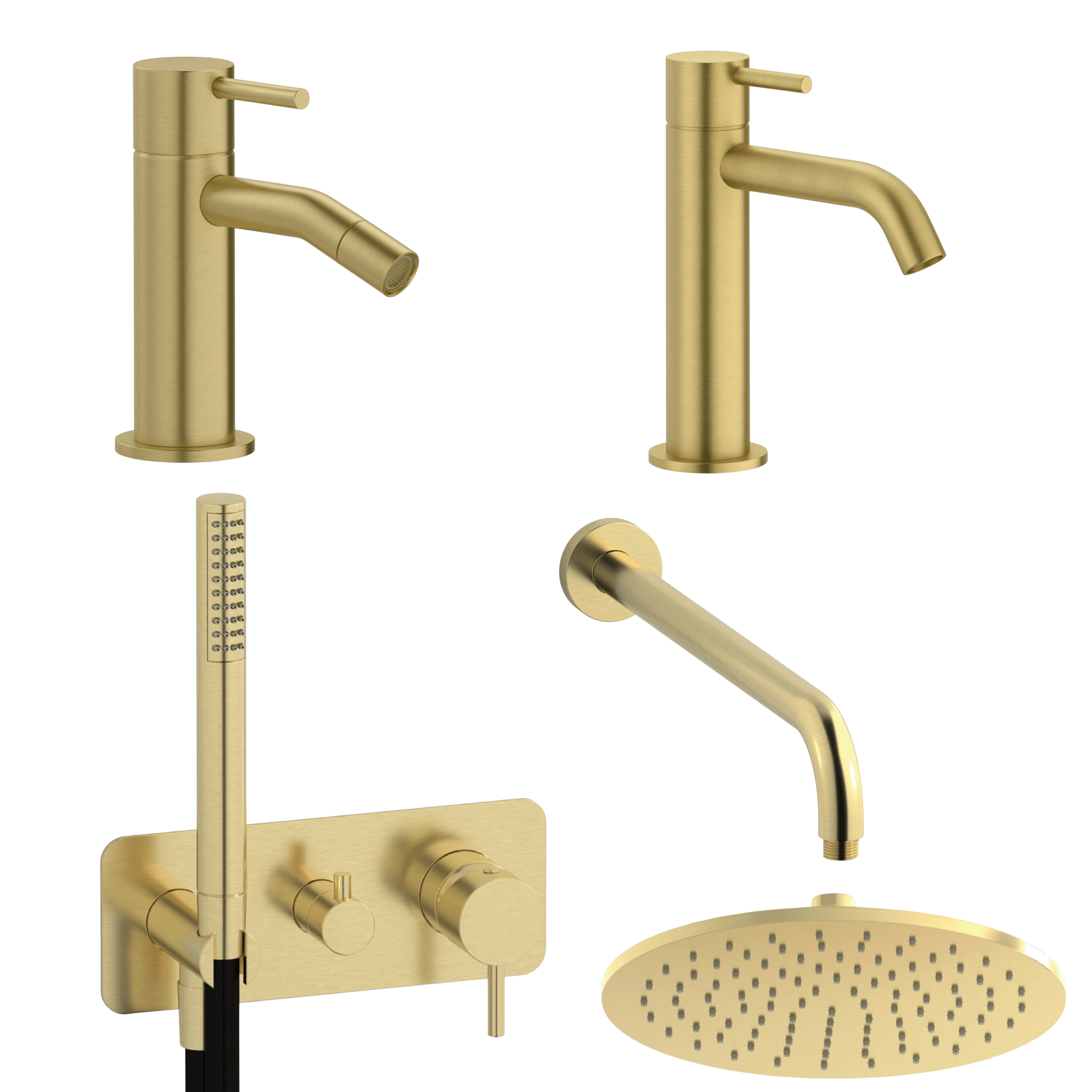Set bagno completo realizzato in acciaio inox 316 con elegante finitura oro inglese spazzolato, ideale per ambienti moderni e ricercati. Il set comprende miscelatore lavabo e miscelatore bidet, braccio doccia con soffione, miscelatore doccia con kit doccetta a 2 vie e flessibile incluso, completo di corpo ad incasso per un’installazione ordinata e funzionale. I miscelatori lavabo e bidet sono forniti senza scarico, per una maggiore libertà di configurazione.