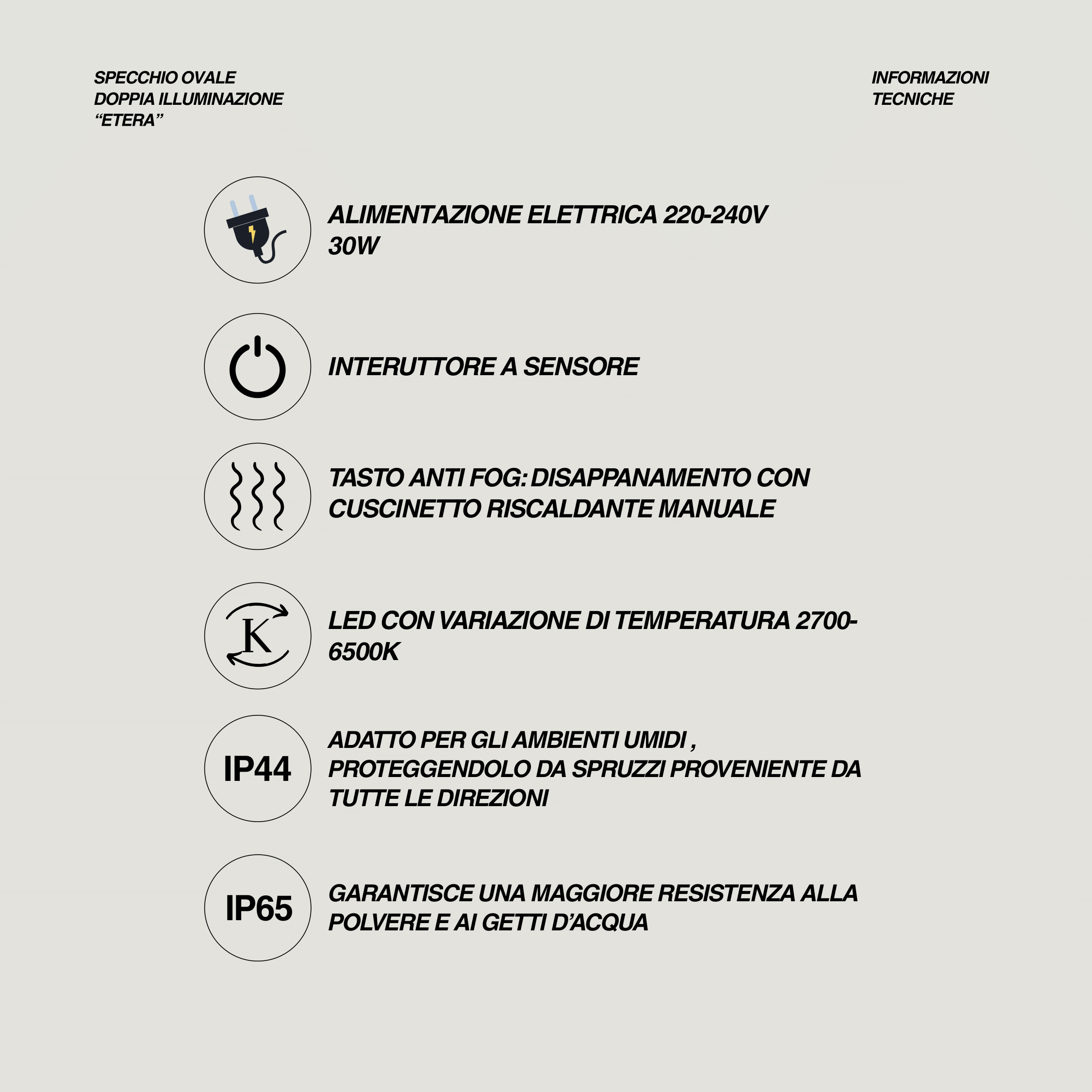 Lo specchio ovale è concepito come un elemento di design che supera la funzione tradizionale e diventa protagonista dello spazio bagno grazie alla sua forma sinuosa che si integra con eleganza in qualsiasi ambiente e alla doppia illuminazione LED che permette di scegliere tra tre tonalità di luce modulando intensità e colore con un semplice tocco per creare atmosfere diverse dal calore avvolgente alla freschezza luminosa trasformando ogni momento in un’esperienza personalizzata la tecnologia smart rende immediato il passaggio da una luce soffusa a una pienamente illuminante mentre il sistema antifog con cuscinetto riscaldante mantiene la superficie sempre nitida anche dopo la doccia garantendo praticità quotidiana la protezione IP44 assicura sicurezza in ambienti umidi e i LED certificati IP65 garantiscono resistenza e durata nel tempo unendo efficienza energetica e affidabilità il design contemporaneo valorizza proporzioni e materiali creando un equilibrio perfetto tra estetica e funzionalità e offrendo un complemento raffinato che risponde alle esigenze di chi desidera un bagno moderno elegante e tecnologicamente avanzato.