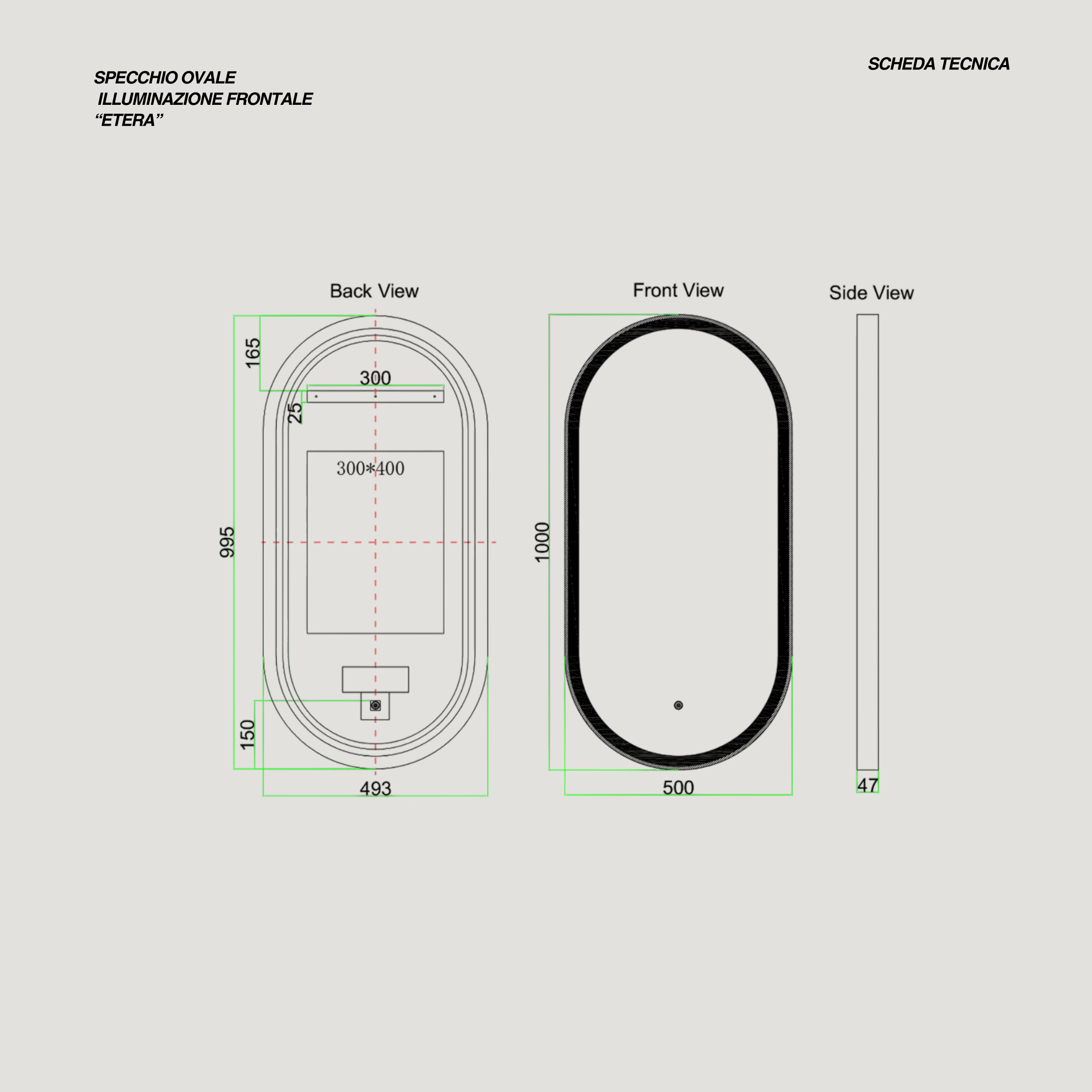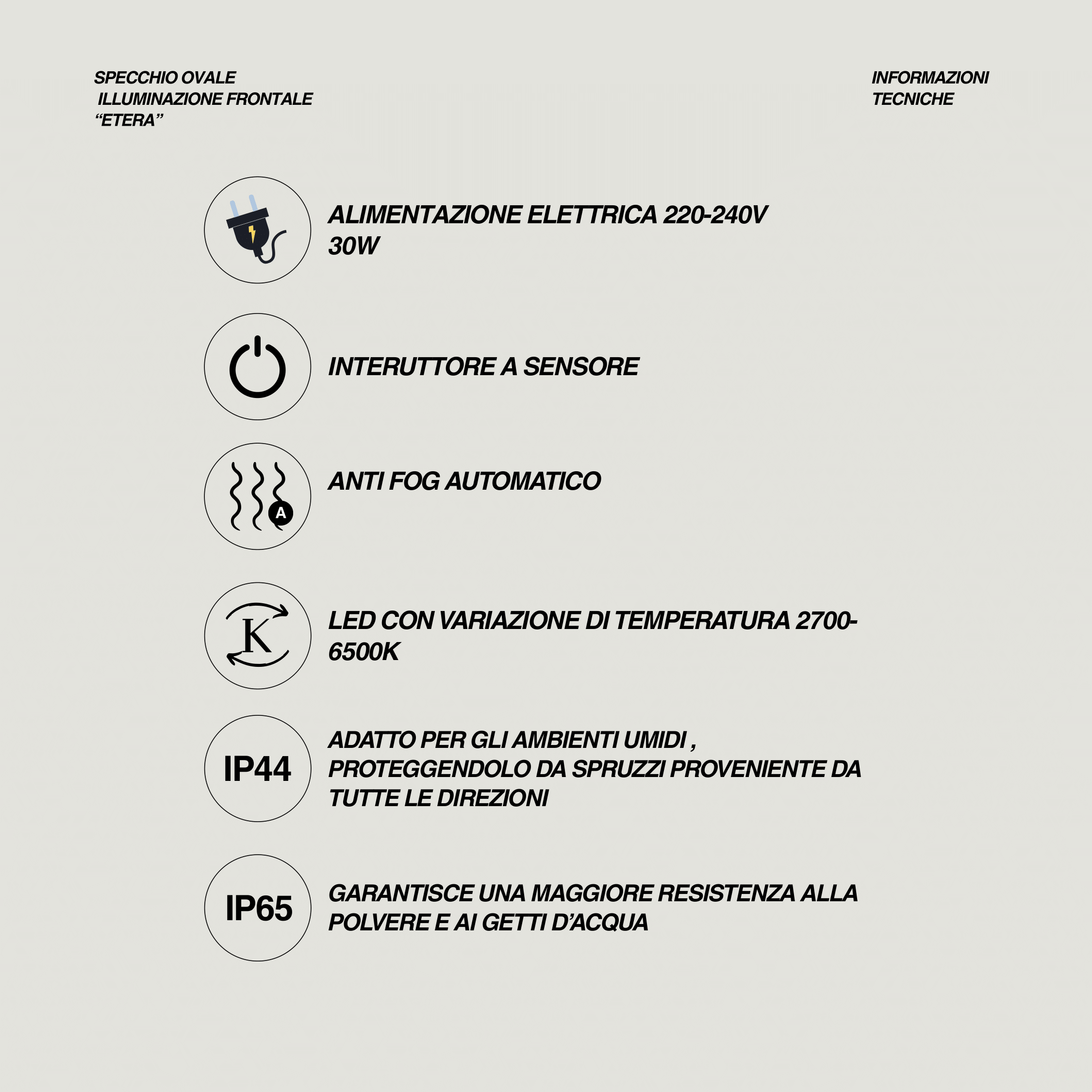Lo specchio ovale da 50x100 cm è un complemento d’arredo che unisce eleganza e funzionalità, pensato per trasformare l’ambiente bagno in uno spazio raffinato e tecnologico. La cornice in acciaio con finitura oro spazzolato conferisce un carattere prezioso e contemporaneo, capace di dialogare con diversi stili di arredamento. L’illuminazione LED frontale integrata garantisce una luce uniforme e regolabile, con la possibilità di variare la temperatura colore da 2700K a 6500K, passando da tonalità calde e avvolgenti a tonalità fredde e brillanti, ideali per le attività quotidiane che richiedono precisione.La tecnologia si esprime anche attraverso funzioni intelligenti come l’interruttore a sensore, che permette di accendere e spegnere la luce con un semplice gesto, e il sistema antifog automatico, che mantiene la superficie sempre nitida anche dopo una doccia calda. La protezione IP44 dello specchio assicura resistenza agli spruzzi d’acqua provenienti da tutte le direzioni, rendendolo perfetto per ambienti umidi, mentre i LED integrati, certificati IP65, offrono una protezione superiore contro polvere e getti d’acqua, garantendo affidabilità e durata nel tempo.