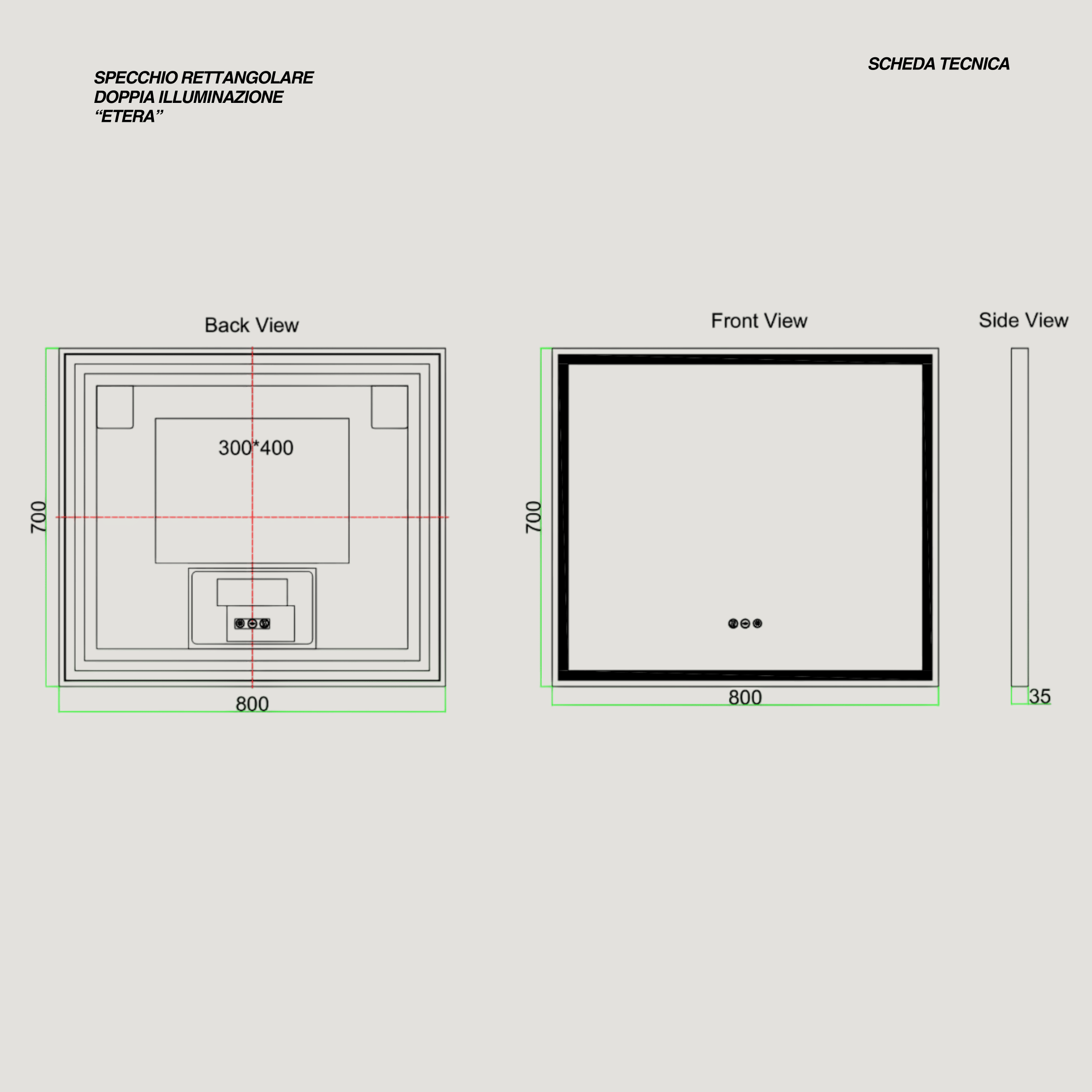 Specchio Rettangolare Doppia Illuminazione 80x70 Con Touch Accensione e Tasto Antifog "Etera"
