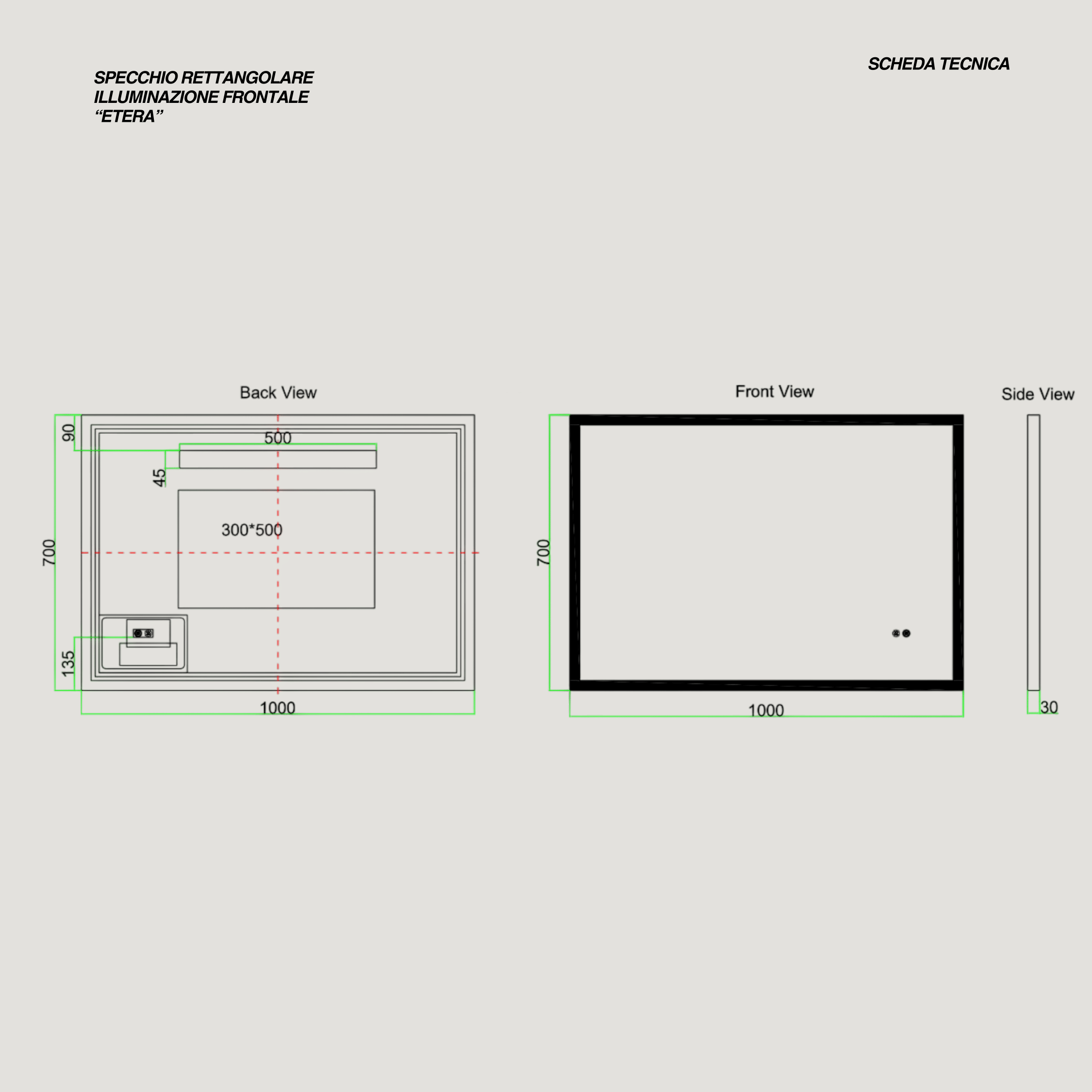 Specchio Rettangolare Illuminazione Frontale 100x70 Con Touch Accensione e Tasto Antifog "Etera"