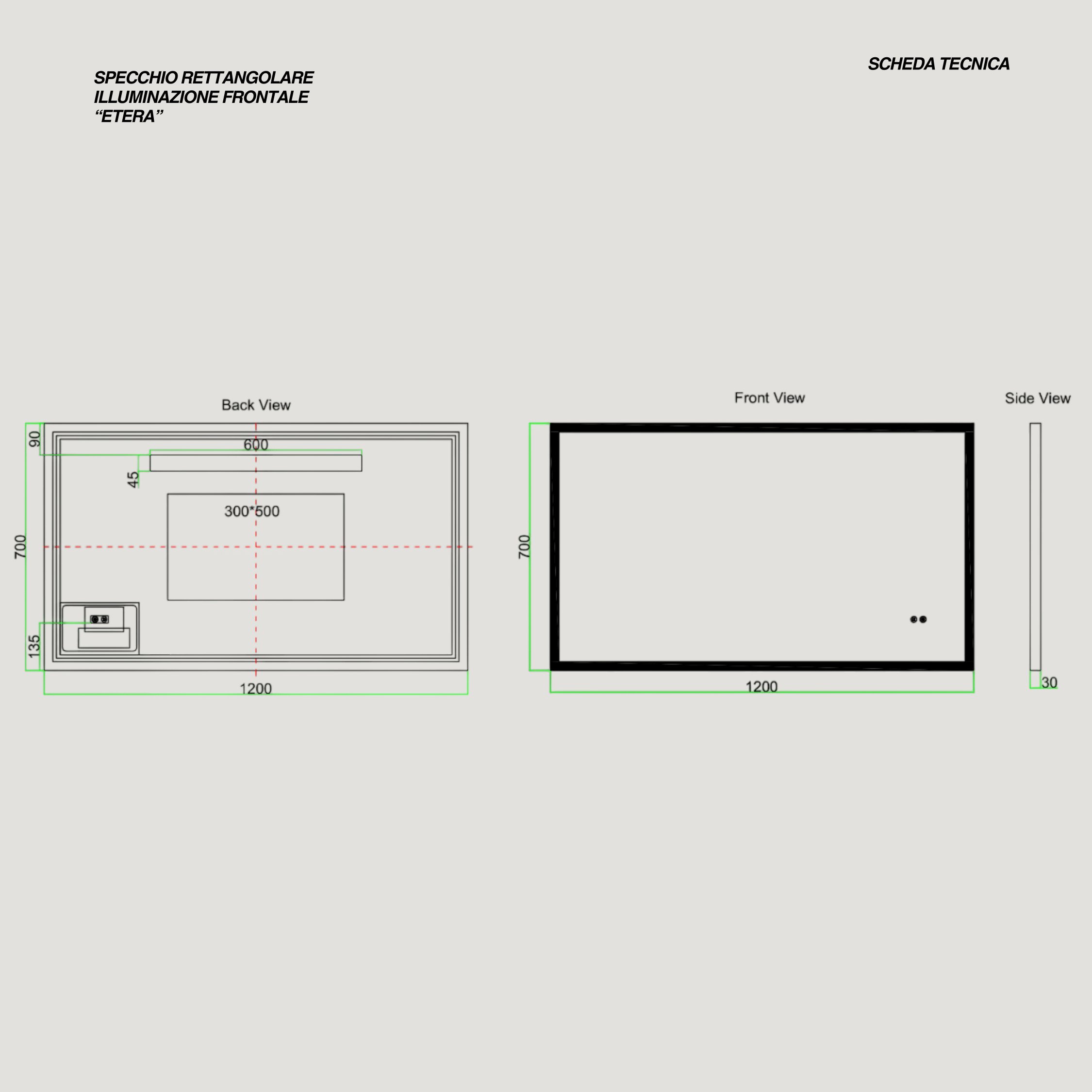 Specchio Rettangolare Illuminazione Frontale 120x70 Con Touch Accensione e Tasto Antifog "Etera"